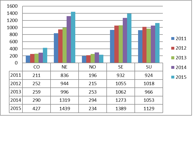 Nesse sentido, a pesquisa mostrou que juntamente com a evolução das organizações coletivas (cooperativas) e a diversificação de produtos da agricultura familiar adquiridos pelo PNAE, o número de municípios comprando da agricultura familiar cresceu, conforme demonstra o Gráfico 5. Apesar da crise com os consecutivos anos de seca, a agricultura familiar continuou produzindo em pequenos espaços, e, como visto nos dados do gráfico abaixo, a região Nordeste avançou consideravelmente no numero de municípios que compraram algum produto da agricultura familiar com recursos do PNAE.