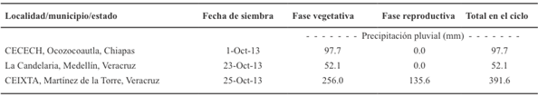 El estudio se realizó durante el ciclo otoño-invierno 2013-2014, en tres localidades. La primera fue en el Ejido La Candelaria, municipio de Medellín de Bravo, ubicada en el centro de Veracruz, a 18° 55’ 19.41” N, 96° 11’ 57.10” O, a una altitud de 22 m. En esta localidad, el clima es cálido subhúmedo Aw0(w) (g), con una precipitación pluvial anual de 1400 mm y temperatura media anual de 25.4 ºC (García, 2004; Díaz-Padilla et al., 2006). La segunda el Campo Experimental Ixtacuaco (CEIXTA), ubicado en el municipio de Martínez de la Torre, en el norte de Veracruz, a 20° 02’ 17.9” N y 97° 05’ 47.0” O, a una altitud de 92 m. Su clima es cálido húmedo Af(m) (e), con una precipitación pluvial anual de 1743 mm y temperatura media anual de 24 °C (García, 2004; Díaz-Padilla et al., 2006). La tercera fue el Campo Experimental Centro de Chiapas (CECECH), municipio de Ocozocoautla de Espinosa, en el centro de Chiapas, a 16° 46’ 50.3” N y 93° 24’ 13.2” O, a una altitud de 805 m. El clima es cálido húmedo (A) C (w1) ig´ con abundantes lluvias en verano, una precipitación pluvial anual entre 800 y 1000 mm, con una media de 898 mm, temperatura media anual de 23.6 °C y media mensual superior a 18 °C (García, 2004; Serrano-Altamirano et al., 2006).