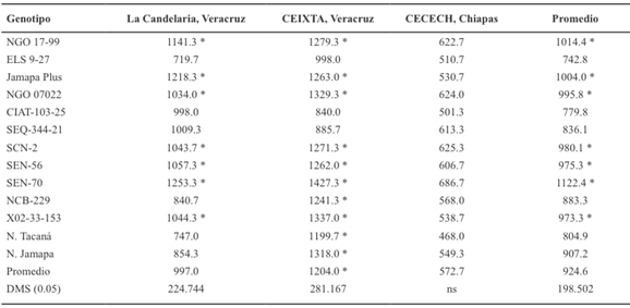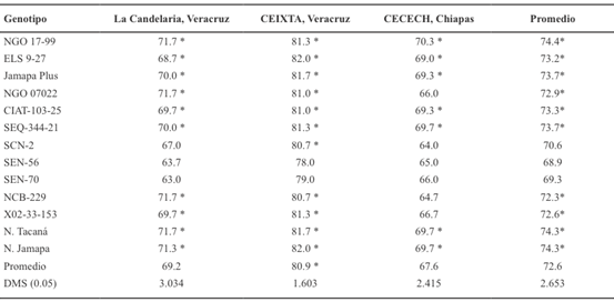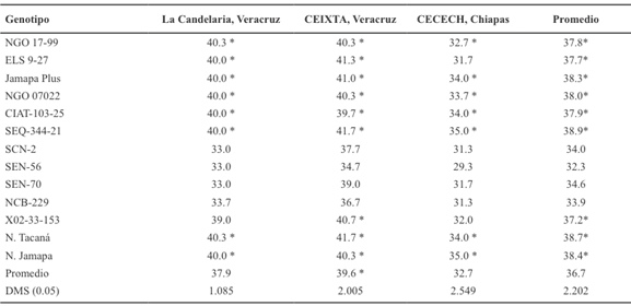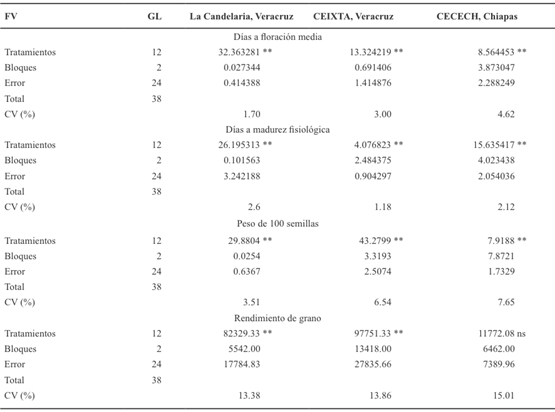 En las tres localidades se detectó significancia estadística entre tratamientos (P ≤ 0.01) en las variables días a floración media, madurez fisiológica y peso de 100 semillas. Respecto al rendimiento de grano, sólo en las dos localidades de Veracruz se encontró efecto significativo entre tratamientos (P ≤ 0.01) (Cuadro 2).