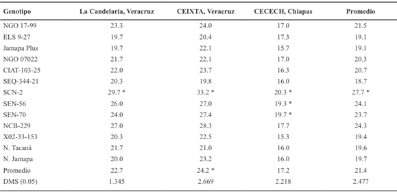 En las tres localidades de prueba, las líneas SEN‑56, NCB-229, SCN-2 y SEN-70, tuvieron un tiempo de floración significativamente más temprano que el resto de los genotipos. De acuerdo al análisis combinado, los días a floración media variaron significativamente entre ambientes de evaluación y genotipos. En la localidad de CEIXTA, se tuvo el mayor número de días a la floración media, los cuales fueron significativamente superiores, a los obtenidos en las otras dos localidades.