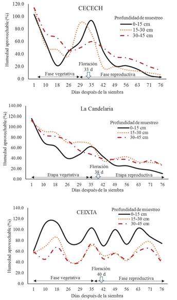 En el CEIXTA, el comportamiento de la humedad aprovechable durante todo el ciclo del cultivo fue muy variable dentro y entre fechas de muestreo, observándose mayor humedad en el estrato 0-15 cm, con promedio de 87.5%, que en los estratos 15-30 cm y 30-45 cm, en donde se obtuvieron promedios de 58.4 y 53.4%, respectivamente (Figura 1). En esta localidad se tuvieron mejores condiciones de humedad para el cultivo, que en los otros dos sitios de evaluación, cuya humedad aprovechable en la etapa de madurez fisiológica, en promedio de los tres estratos fue de 51.9%, en tanto que en La Candelaria y en el CECECH la humedad aprovechable promedio en la misma etapa fue de 28.5 y 6.9%, respectivamente.
