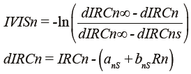 (1)donde: θv es el ángulo cenital de visión, θs el de iluminación solar, χ es una variable angular de posición, R es la reflectancia de cualquier banda, Rn es la reflectancia normalizada por posición angular y efecto de escala (función logaritmo natural) y g es un parámetro que define la geometría sol-sensor. La ventaja del modelo es que solo tiene un parámetro, el cual puede estimarse con un solo dato de medición. En lo siguiente solo se considerarán reflectancias normalizadas y estandarizadas a la geometría θv = 0° y θs = 30°, de tal forma que todas las mediciones espectrales tienen una base común de observación. La inversión del modelo de geometría sol-sensor, relaciones [1], para estimar reflectancias no normalizadas, introduce errores (Bolaños y Paz, 2010), y su uso en índices de vegetación no es adecuada. De esta forma, el índice de vegetación IVIS (Paz et al., 2011) se define en términos de reflectancias normalizadas y estandarizadas: