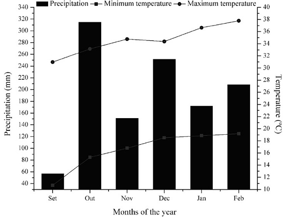 Sowing was performed on 10/18/2016, using cultivar NA 5909 RR at a density of 290,000 plants ha-1. The seeds were inoculated with Bradyrhizobium japonicum and fertilization was based on soil analysis and as recommended by Embrapa (2013) with 250 kg ha-1 of the 03-30-10 NPK formulation. The treatments (23.2 g ha-1 Ni, 31.2 g ha-1 Mo, 23.2 g ha-1 Ni + 31.2 g ha-1 Mo) were applied 25 days after emergence using a CO2 pressurized backpack sprayer, equipped with a spray bar with flat spray tips, type 110 02, spaced 50 cm apart and volume of 150 L ha-1. Throughout the cropping season applications of insecticides, fungicides and herbicides were carried out according to the technical recommendations for the crop. Precipitation and minimum and maximum temperatures during the experiment conduction are presented in (Figure 1).