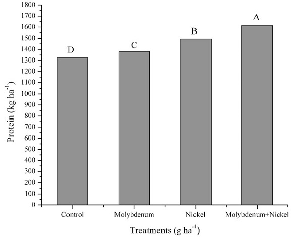 Lopes et al. (2016) found that the application of 80 g ha-1 Mo increased the amount of N and protein content in bean grains, differing from our study which found no effect on these variables by Mo applied individually. Oliveira et al. (2017) found a linear increase in the protein content of soybean when they applied doses of 0 to 800 g ha-1 molybdenum via leaf spray.