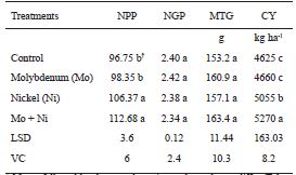 For NGP and MTG, no effects of treatments were observed. These results are in agreement with those of Heidarzade et al. (2016), who found no effect of Mo on mass of a thousand grains.