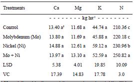 Table 3 presents the data on calcium, magnesium, potassium and nitrogen removal. It can be observed that only nitrogen was influenced by the treatments, where the application of nickel alone increased export by 7%, and the association of molybdenum and nickel did so by 14%, relative to the other two treatments. These results indicate that application of nickel increases urease activity, which causes the plant to assimilate and export more nitrogen (Kutman et al., 2013).