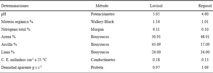 El experimento de incubación aeróbica se realizó en el laboratorio de Ingeniería Ambiental de la Universidad del Mar (campus Puerto Ángel, Oaxaca). El suelo empleado se colectó en campos agrícolas dedicados a la producción de maíz de temporal en el municipio de Zapopan (suelo Regosol); y otro dedicado al cultivo de agave (Agave tequilana) en el municipio de Amatitán (suelo Luvisol). En cada sitio se colectó una muestra compuesta de suelo; el terreno se dividió en diez cuadrantes para obtener submuestras (10) a una profundidad de 0-20 cm. La muestra se mezcló homogéneamente y previo a la caracterización físico-química (NOM-021-RECNAT-2000, 2002), el suelo se secó a temperatura ambiente y tamizó con malla de 2 mm de diámetro (Cuadro 1).