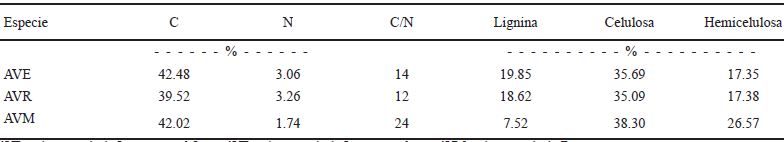C.E. = conductividad eléctrica. E.C. = electrical conductivity.El material vegetal incorporado al suelo como enmienda fue, el abono verde de Lupinus rotudiflorus (AVR) y Lupinus exaltatus (AVE) y de Zea mays (AVM); las especies vegetales se cultivaron durante el ciclo de primavera-verano del 2016 en el campo agrícola experimental del Centro Universitario de Ciencias Biológicas y Agropecuarias (CUCBA, U. de G.) en Zapopan, Jalisco. La cosecha de las plantas fue en la etapa vegetativa, se secaron en estufa de aire forzado a 65 °C hasta obtener peso seco constante y posteriormente se molieron a un tamaño de partícula de 1 mm y se determinó el contenido de lignina mediante el método D 1106-56, el contenido de celulosa y hemicelulosa fue determinado por el método D 1103-60, (clave 1977a y 1977b, respectivamente) conforme a las normas establecidas por la American National Standard Institute (ANSI/ASTM) (Cuadro 2). La concentración de C y N se cuantificó con un analizador elemental CHSN-O Leco TruSpec® LECO Corporation.