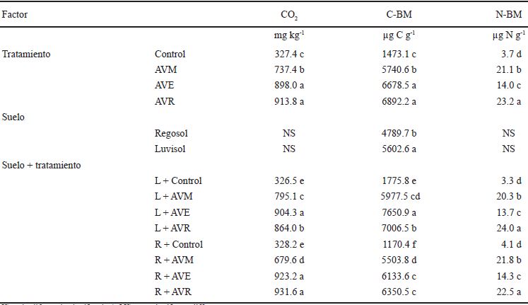 La biomasa microbiana total en el suelo incluye a todos los organismos vivos (latentes y activos) y muertos; la fracción activa es la porción de la biomasa microbiana total, involucrada en la utilización del sustrato, o bien, que responde fácilmente a la entrada de sustrato (Blagodatskaya y Kuzyakov, 2013); y la respiración microbiana es comúnmente usada para cuantificar la actividad metabólica de los microorganismos del suelo. En la incubación aeróbica por 14 días, la producción de CO2 presentó diferencias significativas (P ≤ 0.05) entre tratamientos, pero no para el tipo de suelo Regosol y Luvisol (Cuadro 3). El valor promedio de la producción de CO2 fue significativamente mayor en el suelo tratado con enmiendas en comparación al suelo control. Con el AVE, AVR y AVM, el promedio fue de 913.8, 898.0 y 737.4 mg kg-1 de CO2, respectivamente; el valor promedio del control fue 327.4 mg kg-1 de CO2; los resultados anteriores indican que la adición de enmienda contribuyó con una fuente de carbono disponible para incrementar la producción de CO2, presentando un efecto iniciador positivo. En la interacción entre suelo y tratamientos, la producción de CO2 en el control fue menor y significativamente diferente (326.5 y 328.2 mg kg-1 en el suelo Luvisol y Regosol, respectivamente) con respecto al tratamiento con enmienda (Cuadro 3). El tratamiento con AVM en el suelo Regosol produjo en promedio un 30% menos de CO2 con respecto a los tratamientos AVE y AVR. En el suelo Luvisol, la producción de CO2 fue significativamente diferente entre AVE, AVR y AVM, con valores de 904.3, 864.0 y 795.1 mg kg-1 CO2, respectivamente (Cuadro 3).
