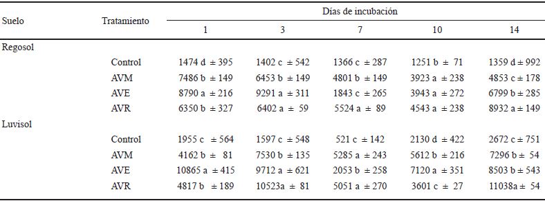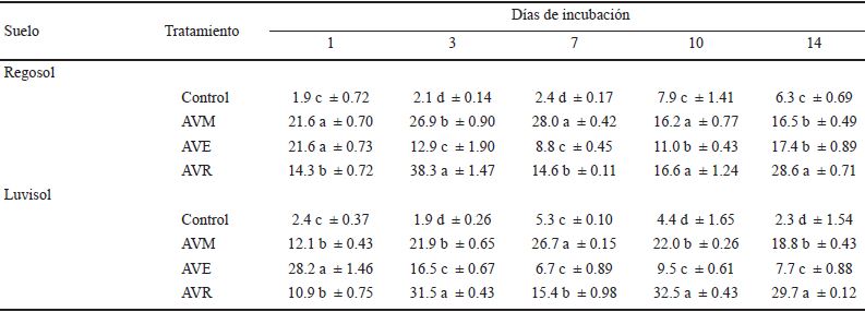 El C-BM en el tratamiento con AVE y AVR (6892 y 6678 µg C g-1, respectivamente) fue mayor y significativamente diferente al tratamiento AVM (5740 µg C g-1) y el control (1476 µg C g-1). Con relación al tipo de suelo, existieron diferencias significativas (P ≤ 0.05) en el contenido de C-BM; en el suelo Luvisol (L) y Regosol (R) el valor promedio durante los 14 días de la incubación aeróbica fue de 5602.6 y 4789.7 µg C g-1, respectivamente. De la interacción suelo + tratamiento, en L+AVE y L+AVR se registraron los mayores promedios (7650.9 y 7006.5 µg C g‑1), seguidos por el promedio de R+AVR y R+AVE (6350.5 y 6133.6 µg C g‑1); en el tercer grupo se ubicó a L+AVM y R+AVM (5977.5 y 5503.8 µg C g-1), y finalmente al control con un promedio en ambos suelos de 1472.5 µg C g-1 (Cuadro 3).