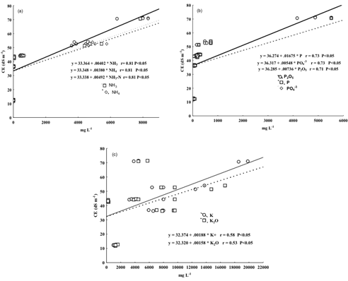 † Literales diferentes por columna indican diferencias estadísticas según la prueba de Tukey (P ≤ 0.05).† Different letters for each column indicate statistical differences, according to the Tukey test (P ≤ 0.05).Respecto a la conductividad eléctrica (CE), ésta refleja la salinidad de los materiales y es un buen indicador para la aplicación de abonos orgánicos con fines agrícolas (Simón et al., 2013). Los fertilizantes son sales que modifican la CE por la capacidad que tengan de intercambiar electrones, un aumento de sales en una solución incrementa la CE. De acuerdo a la norma oficial mexicana (NOM-021-RECNAT-2000, 2002) la CE de suelos debe estar por debajo de 4 dS m‑1 para ser suelos apropiados para la producción agrícola. De hecho, Yepes y Flórez (2013) menciona que una CE baja facilita el manejo de la fertilización y se evitan problemas por fitotoxicidad en los cultivos, en lo posible menor a 1 dS m-1. Los resultados de los abonos orgánicos estudiados, exceden por mucho estos valores que como se mencionó previamente están relacionados con la concentración de los elementos contenidos en cada abono. Los resultados muestran una relación positiva significativa (Figura 1) entre los nutrientes contenidos de, NH3, NH4+, P, PO4-3, K+ y K2O en los abonos estudiados y la CE. La gallinaza, guano de murciélago y estiércol de vaca presentaron los mayores valores de estos nutrientes y de CE, lo cual concuerda con lo que menciona Kaviraj y Sharma (2003) quienes mencionan que el incremento en la CE puede deberse a la liberación de iones minerales como los contenidos en los abonos estudiados en este trabajo.
