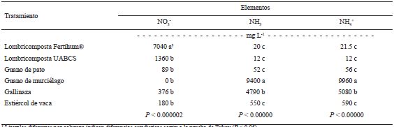 Los resultados de éste trabajo mostraron que el abono de guano de murciélago y la gallinaza presentaron la cantidad más alta de nitrógeno en las formas de NH3 y NH4+ (Cuadro 1), cantidades similares de nitrógeno a las encontradas en este estudio, han sido también reportados por Szpak et al. (2012a), quienes a su vez mencionan que el guano de aves marinas fue el fertilizante económicamente más significativo durante el siglo XX debido a estos altos contenidos de nitrógeno. Los contenidos más altos en nitrógeno en forma de NO3- fue la lombricomposta Fertium® (Cuadro 1), estos resultados están de acuerdo con lo encontrado por Suthar (2008) y Beltrán (2016) quienes mencionan que la acción de la lombriz de tierra sobre los residuos orgánicos que ingesta implica la combinación de la motilidad muscular que permite homogeneizar el material, mientras que le va agregando mucosidad y enzimas incrementando el área de contacto de la acción microbiana. De esta forma se incrementa la cantidad de nitrógeno en sus formas más asimilables para este tipo de abonos comparadas con los guanos de pato, murciélago, gallinaza y estiércol de vaca. Desde el punto de vista agrícola el nitrógeno en forma de NO3- es útil para las plantas (Hadas y Rosenberg, 1992) por lo que los fertilizantes analizados de lombricomposta resultan adecuados por el contenido de nitrógeno en esa forma. El guano de murciélago y la gallinaza con el más alto contenido de NH4+ que es asimilable por las plantas, también se presentan como buenos fertilizantes (Gross et al., 2012). En estos dos abonos orgánicos es importante considerar el alto contenido de nitrógeno en forma de NH3, por lo que su aplicación en suelo con fines de fertilización deberá sufrir una nitrificación para absorberlo (Manojlović et al., 2010).