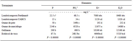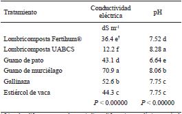 † Literales diferentes por columna indican diferencias estadísticas según la prueba de Tukey (P ≤ 0.05).† Different letters for each column indicate statistical differences, according to the Tukey test (P ≤ 0.05).El K+ es un macroelemento que desempeña un papel muy importante en las plantas, en la apertura estomática donde las células guarda se abren con la acumulación del K+ y se cierran con su pérdida. Contribuye a mantener niveles altos de turgencia a través de la retención de agua en las células, participa en la activación de enzimas en la fotosíntesis, así como en la calidad de los cultivos (Tavakol et al., 2018). Los resultados del análisis de cada abono orgánico mostraron que la lombricomposta comercial, el guano de murciélago y la gallinaza tuvieron los valores más altos de las dos formas de potasio que se analizan (K+, K2O) (Cuadro 2). Lo anterior concuerda con autores como Grantina-Ievina y Ievinsh (2015) quienes plantean que en el caso del guano estos valores son altos debido a una alta mineralización del guano en el suelo después de que las aves lo depositan. En el caso de la lombricomposta, Suthar (2008), reportó que durante el proceso de vermicomposta se incrementa el contenido de K+ entre un 104 a 160% del material inicial, si bien esto puede variar dependiendo de los materiales vermicompostados, la tendencia siempre es a aumentar su contenido durante el proceso.