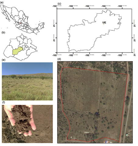 La UE (Figura 1) corresponde a un potrero dedicado a la cría de ganado bovino, representativo de las áreas de pastizal, donde también se asienta la agricultura de secano del Bajío del Centro de México (Montiel-González et al., 2017). Se ubica en el área experimental (21.973° N y 102.374° O) del Centro de Ciencias Agropecuarias de la Universidad Autónoma de Aguascalientes (CCA-UAA). En términos fisiográficos, éste lugar se sitúa en la Sub-Provincia Sierras y Valles Zacatecanos de la Región Sierra Madre Occidental. El clima predominante es seco (BSkw), con promedios anuales de temperaturas y precipitación de 18 °C y 540 mm, respectivamente (INEGI, 2017).