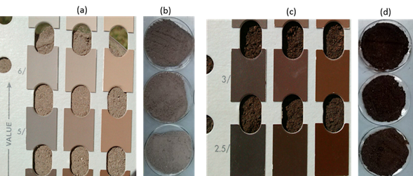 1 = arena; 2 = limo; 3 = arcilla; C = francosa; Ca = franco arenosa; MOS = materia orgánica del suelo; da = densidad aparente; Pt = porosidad total; CC = capacidad de campo; PMP = punto de marchitez permanente. 1 = sand; 2 = silt; 3 = clay; C = loam; Ca = sandy loam; MOS = soil organic matter; da = apparent density; Pt = total porosity; CC = field capacity; PMP = permanent wilting point.Además, como parte de la descripción morfológica se determinó el color del suelo, tanto en seco como en húmedo, de cuya visualización mediante el uso de la tabla de colores Munsell, presentó una variación de café (7.5 YR 5/2) a negro muy obscuro (7.5 YR 3/1), respectivamente (Figura 2).