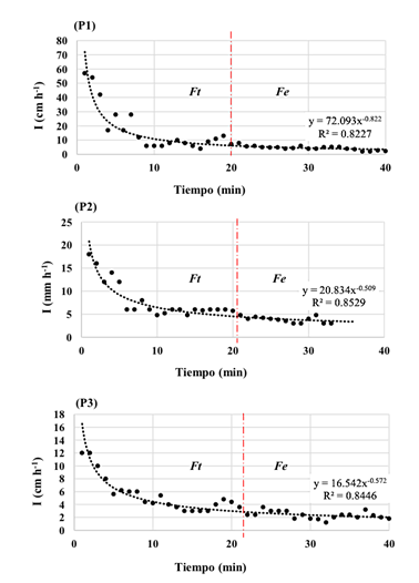 La clase de permeabilidad definida a partir de pruebas de infiltración in situ permitió distinguir el movimiento del agua en condiciones insaturadas y saturadas. La primera, se reconoce como flujo dinámico o transitorio (Ft), en tanto que la segunda como flujo estacionario (Fe). La duración de las pruebas fueron de 45 min para cada sitio, de manera que los cambios de sucesión de Ft a Fe, delimitadas por una línea roja vertical, tuvieron un rango de alrededor de 0-20 min (Figura 3).