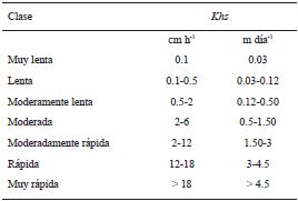 Fuente: USDA-NCR, 1999. Source: USDA-NCR, 1999.Para definir la clase de infiltración (Cuadro 1), las Khs estimadas con base en el modelo K-L antes descrito, fueron convertidos mediante logaritmo base 10, como producto; esto en virtud de que se trata de expresión matemática de forma potencial (Ecuación 3).
