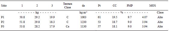 Las constantes de humedad para capacidad de campo (CC) y punto de marchitez permanente (PMP) tuvieron una variación de 0.7 y 0.4%, respectivamente. Para ambas variables, las diferencias más importantes se dieron entre los sitios P1 y P3 que fueron de 1.4% para CC y 0.7% para PMP (Cuadro 2).