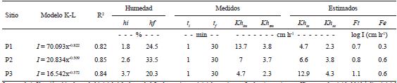 I = tasa de infiltración; hi = humedad inicial; hf = humedad final; ti = tiempo inicial; tf = tiempo final; min = minutos; Khim = conductividad hidráulica inicial medida; Khsm = conductividad hidráulica a saturación medida; Khte = conductividad hidráulica transitoria estimada; Khse = conductividad hidráulica saturada estimada; log = logaritmo con base 10; Ft = flujo transitorio; Fe = flujo estable. I = infiltration rate; hi = initial humidity; hf = final humidity; ti = initial time; tf = final time; min = minutes; Khim = measured initial hydraulic conductivity; Khsm = hydraulic conductivity at measured saturation; Khte = estimated transient hydraulic conductivity; Khse = estimated saturated hydraulic conductivity; log = logarithm with base 10; Ft = transiet flow; Fe = stable flow.Con base en los valores medidos en campo desde t= 0 hasta t = 30 (min), para los tres sitios (P1, P2, P3) se obtuvieron los modelos potenciales (negativos), cuyos coeficientes de estimación resultaron suficientemente confiables por tener valores (R2) ≥ 0.82. A partir de éstos modelos se calcularon las tasas de infiltración en cm h-1 para las condiciones de flujo transitorio o dinámico (Khte ) y para el flujo estacionario (Khse ). Al final, con esta prueba, se observó que la conductividad hidráulica en el sitio P1 es dos veces menor que la registrada en P2 y P3 (Cuadro 3).