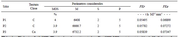 FKr basado en Wischmeier y Smith (1978); FKe estimado con la ecuación revisada por Yang (1999). MOS = materia orgánica del suelo; M = % de arena fina + % de limo × 100 - % de arcilla; S = tipo de estructura (2 = gránulo fino y grumo fino); P = define el tipo de permeabilidad (5 = lenta). FKr based on Wischmeier and Smith (1978); FKe estimated with the equation reviewed by Yang (1999). MOS = soil organic matter; M =% fine sand +% silt × 100 -% clay; S = type of structure (2 = fine granule and fine lump); P = defines the type of permeability (5 = slow).