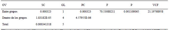 OV = origen de la variación; SC = suma de cuadrados; GL = grados de libertad; PC = promedio de cuadrados; F = valor de F; P = probabilidad; VCF = valor crítico para F. OV = origin of the variation; SC = sum of squares; GL = degrees of freedom; PC = average of squares; F = F value; P = probability; VCF = critical value for F.