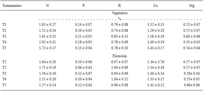 Fechas de anillado: T1 = 15 de agosto; T2 = 15 de septiembre; T3 = 15 octubre T4 = 15 de noviembre y T5 = sin anillar. La concentración de N, P, K y el Ca se ubican en los rangos presentados por Maldonado-Torres et al. (2007) como estándares para este cultivo. Girdling dates: T1 = August 15; T2 = September 15; T3 = October 15; T4 = November 15; and T5 = without gardling. The concentration of N, P, K and Ca are located in the ranges presented by Maldonado-Torres et al. (2007) as standards for this crop.Inicio de floración