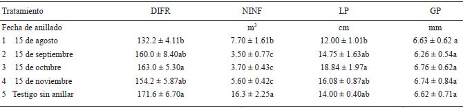 DIFR = días a inicio de fructificación; NINF = número de inflorescencias por m3, LP = largo de panícula y GP = grosor de panícula. † Letras diferentes indican diferencia estadística (Duncan P ≤ 0.05). DIFR = days at the beginning of fruiting; NINF = number of inflorescences per m3; LP = panicle length and GP = panicle thickness. † Different letters indicate statistical differences (Duncan P ≤ 0.05).El adelanto en floración conlleva a un desfasamiento en las etapas fenológicas de los árboles. En la fenología del aguacate ‘Hass’ Cossio-Vargas et al. (2008) indicaron que, para las condiciones climáticas de la zona productora de Nayarit, aun cuando se presentan dos momentos de emisión de brotes reproductivos, solo se registra un momento de antesis al año en el mes de enero, por lo que la cosecha se concentra en los meses de septiembre a noviembre. Los resultados de la presente investigación indican que al efectuarse el anillado el 15 de agosto se induce una floración temprana (noviembre) y se provoca un adelanto también de la etapa fenológica de fructificación, esto permite adelantar la cosecha al mes de mayo.
