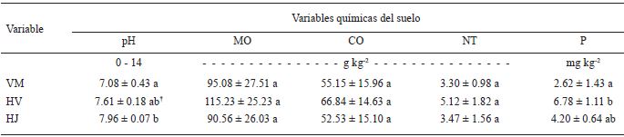 Los valores de MO del suelo pueden ser un parámetro útil para evaluar la degradación de un sitio (Velasquez et al., 2007). De hecho, la productividad de los suelos tropicales en gran medida se debe a la materia orgánica acumulada por los ecosistemas originales (Huerta et al., 2008), así como por el uso de buenas prácticas agropecuarias sustentables (Kloster et al., 2016). En los presentes resultados se reconoció una tendencia a que la cantidad de la MO fuera mayor para HV (115.23 ± 25.23 g kg-1) con relación a VM (95.08 ± 27.51 g kg‑1) y HJ (90.56 ± 26.03 g kg-1). Estos hallazgos para MO en HV y HJ, coinciden con los valores de acumulación referidos por Marrs y Watt (2006). Ellos mencionan que en sitios colonizados por el helecho, la cantidad de MO puede presentar una amplia oscilación, entre 10 - 920 g kg-1 de suelo colectado, dependiendo de la variación de las condiciones ambientales que favorezcan o no al helecho.