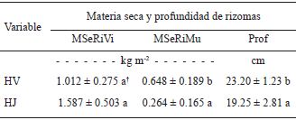 La materia seca de los rizomas muertos mostró diferencias significativas entre HV y HJ con valores t = 3.04; P ≤ 0.05 (Cuadro 2). La condición HV tuvo 145% más cantidad de rizomas muertos comparado con HJ. Por su parte, para la materia seca de los rizomas vivos, no se encontraron diferencias significativas, pero sí numéricas con base en los valores medios. HJ presentó 36% más rizomas (16 Mg ha-1) con respecto a HV (Cuadro 2). Para la profundidad de los rizomas, se identificaron diferencias significativas entre HV y HJ con valores t = 2.57; P ≤ 0.05 (Cuadro 2).