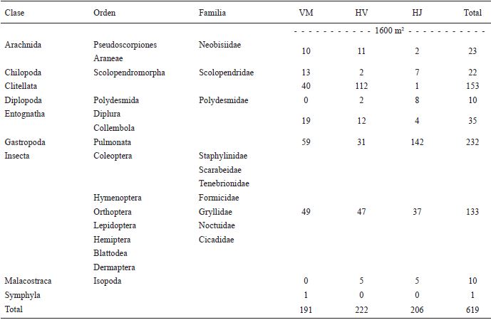 Se muestreó un total de 4800 m2 de suelo en donde se encontraron 619 macroinvertebrados que correspondieron a 9 clases, 15 órdenes y 10 familias (Cuadro 3). De estos, 12 individuos (1.9%) fueron determinados hasta género, 95 (15.3%) a nivel de familia, 421 (68.0%) hasta orden y 619 (100%) a nivel de clase. En VM, las clases dominantes fueron Gastropoda, Insecta y Clitellata, que representaron 74% del total de especímenes. Para el caso de HV, las clases más representativas fueron Clitellata e Insecta con 72% del total de colectas; por último, para HJ fueron Gastropoda e Insecta con 87% del total de organismos.