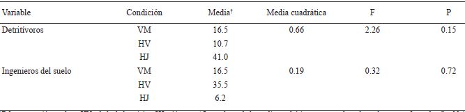 El análisis de varianza de un factor no mostró diferencias significativas para los dos gremios más abundantes: detritívoros e ingenieros del suelo entre la vegetación madura y helechales viejos y jóvenes (P > 0.05) (Cuadro 4).