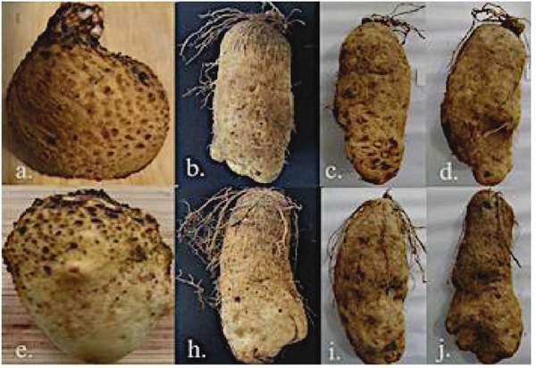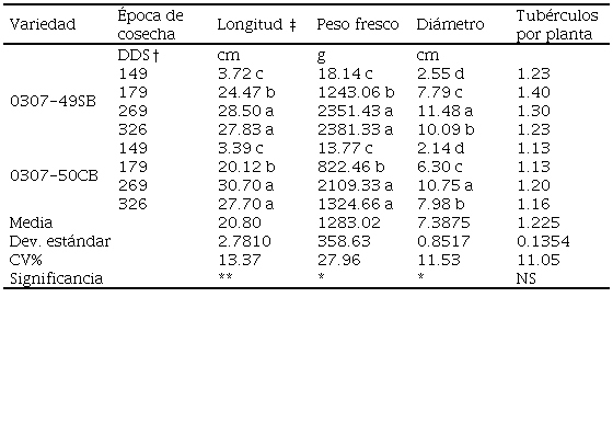 La longitud, diámetro y peso de los tubérculos de ñame cosechados a los 149, 179, 269 y 326 días después de la siembra (DDS) en este experimento se muestran en el Cuadro 3. Los tubérculos cosechados a 149 y 179 DDS presentaron menor longitud, diámetro y peso fresco que los tubérculos cosechados a 269 y 326 DDS. Acorde a las observaciones, los tubérculos cosechados a 149 DDS presentaban menor tamaño, se encontraban apenas iniciando su formación, presentaban yemas inmaduras, y se encontraban en un estado que es comúnmente conocido como “cormo”. Por su parte los tubérculos cosechados a 179 DDS, presentaban mayor tamaño, se encontraban en proceso de acumulación activa de materia fresca y, al igual que los anteriores, mostraban algunos signos que indicaban inmadurez del tubérculo, debido a que el extremo distal presentaba color blanquecino, característico de crecimiento activo. Por el contrario, los tubérculos cosechados a los 269 y 326 DDS presentaron mayor tamaño y peso, con yemas desarrollada y coloración que indicaba que habían alcanzado su madurez fisiológica ( Figura 1). Estos resultados en general coinciden con lo reportado por Ile et al. (2006) , en cuanto al grado de desarrollo de los tubérculos.