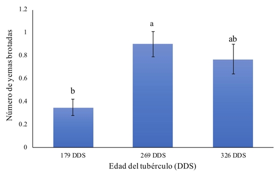 La evaluación de la brotación de las secciones de los tubérculos se realizó mediante muestreos destructivos realizados a 7, 14 y 21 días después de los tratamientos (DDT). Los resultados mostraron brotación solamente en los tubérculos de 179, 269 y 326 DDS. No se observó brotación en los tubérculos cosechados a 149 DDS ( Figura 2), lo que se atribuyó a un insuficiente desarrollo e inmadurez de los tejidos meristemáticos, lo cual fue corroborado por las observaciones histológicas.
