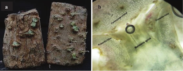 Cada muestra para observación se preparó removiendo la superficie del tejido y tomado porciones de 5.0×0.9×0.9 cm, las cuales fueron diafanizadas con inmersión en agua por 15 min. Posteriormente, fueron introducidas en alcohol al 70% (1 h), alcohol al 90% (1 h), xileno (1 h) e incluidas en parafina líquida. Con la ayuda de un microtomo rotativo (American Optical Corporation, Spencer 820, Bethlehem, Pennsylvania, USA), se obtuvieron 720 muestras del tejido para observación. Posteriormente, las muestras fueron desparafinadas mediante hidratación, empleando concentraciones decrecientes de etanol (100, 96, 80, 50% y xileno); y teñidas con azul de alcián al 0.05%. Seguidamente, los tejidos fueron deshidratados en grupos crecientes de etanol (96, 100% y xileno). Los tejidos se observaron en microscopio binocular para campo claro DM500 (Leica ®, USA) conectado a una cámara ICC50W (Leica ®, USA). Al microscopio se registró el número de yemas brotadas en cada una de las secciones.