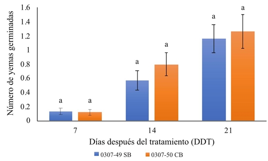 Con relación a los genotipos, no se presentaron diferencias estadísticas en la brotación, entre las dos variedades evaluadas en los muestreos realizados ( Figura 4).