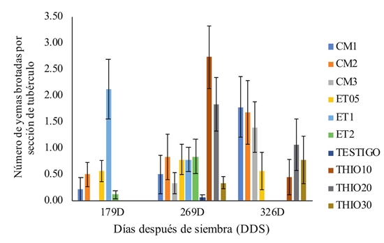 A través de contrastes ortogonales se compararon los efectos de las diferentes dosificaciones de los RCV, encontrando mayor efecto de la dosis de 1.0 g L -1 de etefón (en tubérculos de 179 DDS), 10 g L -1 y 20 g L ‑1 de thiourea (en tubérculos de 269 DDS) y 1.0 g L -1 de cloruro de mepiquat (en tubérculos de 369 DDS). Por otro lado, el tratamiento testigo (sin aplicación de RCV), no mostró ningún signo de brotación en los muestreos realizados, corroborando el estado de reposo natural en que se encontraban los tubérculos. Tan solo se observó cierto grado de brotación en los tubérculos de 269 DDS ( Figura 5).