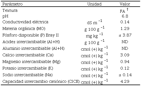La siembra en campo se realizó en un área de terreno 800 m 2, en una finca localizada en la vereda El Llano, municipio de Ciénaga de Oro, Córdoba, ubicada geográficamente a 8° 47’ 20” N y 75° 35’ 20.1” O, con 163 m de altitud. Las condiciones ambientales durante el desarrollo del cultivo en el sitio experimental fueron: temperatura media de 27.8 °C, humedad relativa de 85% y precipitación de 1350 mm. Las plántulas de ñame se sembraron al inicio de la temporada de lluvias, en el mes de abril, con distancia de 1.0 m entre surcos y 1.0 m entre plantas, para una densidad de población de 10 000 plantas por hectárea (pl ha -1). Las características fisicoquímicas del suelo en el sitio experimental se muestran en el Cuadro 1.