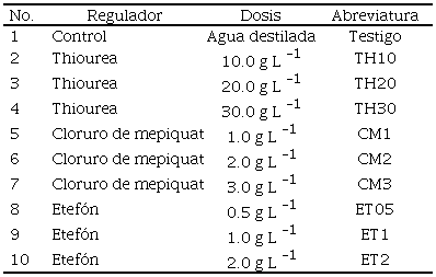 Se evaluó la aplicación de tres dosis de tres RCV sobre la brotación de tubérculos de ñame cosechados a los 149, 179, 269 y 326 días después del tratamiento (DDT), en dos variedades de ñame espino (0307-49SB y 0307-50CB). Los 10 tratamientos evaluados se muestran en el Cuadro 2.