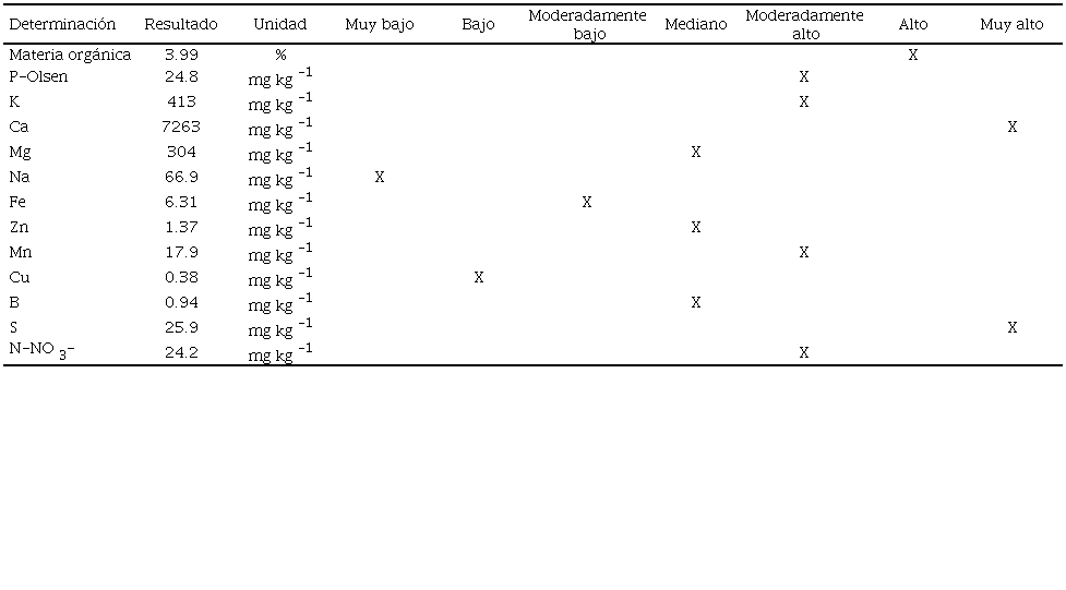 El suelo utilizado en el tratamiento correspondiente tenía una textura franco arcillosa, con un punto de saturación de 58%, capacidad de campo de 31%, punto de marchitez permanente de 18.4%, conductividad hidráulica 1.10 cm hr -1, densidad aparente 1.15 g cm ‑3, carbonatos totales 8.42%, conductividad eléctrica 1.15 dS m -1, y pH (1.2 agua) 7.98. El análisis de la composición química del suelo se indica en el Cuadro 1.