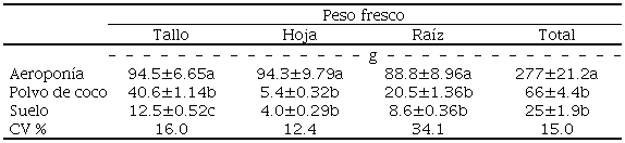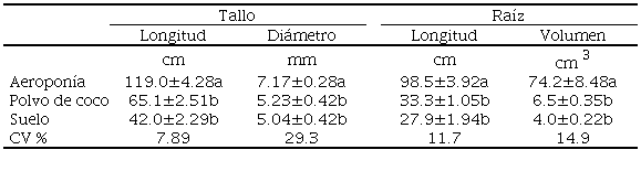 La longitud del tallo de las plantas en aeroponía fue mayor que el obtenido en polvo de coco y suelo ( Cuadro 2). Farran y Mingo-Castel (2006) registraron para plantas en aeroponía un promedio de 100 cm de longitud de tallo, similar a las obtenidas en la presente investigación, mientras que Ritter et al. (2001) y Tierno et al. (2014) obtuvieron plantas de 165 y 92.7 cm de longitud, respectivamente. En el presente estudio, las plantas en polvo de coco obtuvieron una longitud mayor a los 47 cm reportados por Flores-López et al. (2009) y a los 59.3 cm registrados por Vásquez-Ramírez, Pérez y Lara (2019). Las plantas desarrolladas en suelo mostraron la menor longitud de tallo ( Cuadro 2). La misma tendencia se observó en otras variables como el diámetro de tallo y la longitud y volumen de raíz ( Cuadro 2), así como en el peso fresco de hojas, tallos, raíces y total ( Cuadro 3).