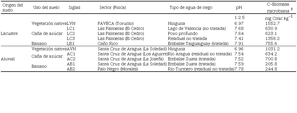 En cada uno de los dos tipos de suelos se ubicaron tres usos de la tierra diferentes: vegetación natural o nativa, monocultivo de caña de azúcar y monocultivo de banano. En los suelos con vegetación nativa predominan especies arbóreas y arbustos autóctonos de la zona. Esos suelos nunca habían sido objeto de ninguna práctica agrícola, por tanto, se estudiaron como suelos testigos o control. En los suelos de origen lacustre, la caña de azúcar y el banano fueron cultivados por un período de 13 y 20 años respectivamente; mientras que, en los suelos aluviales, la caña de azúcar se había establecido desde hacía cuarenta y tres años y el banano tenía seis años sembrado (previamente se producía maíz en estos últimos, por un período mayor de una década). En los suelos agrícolas prevalecía un manejo convencional, con uso de fertilizantes químicos y pesticidas y en la mayoría de los casos se empleaban para irrigación, aguas residuales sin tratamiento o solo con tratamiento primario (Cuadro 1). Adicionalmente, los suelos bajo banano recibían gallinaza como abono orgánico. En el manejo de la caña de azúcar siempre se practicó la quema antes de la cosecha (Ruiz y Paolini, 2004).