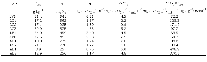 En el Cuadro 3 se presentan las medias de las concentraciones de Corg y CHS, de la RB y los coeficientes metabólicos, agrupados de acuerdo al uso del suelo (vegetación natural, cultivo de caña de azúcar, cultivo de banano).