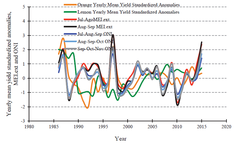 In summary, effects of ENSO events could be measured as their’ immediately impact on crop yields. For instance, corn yields of the Southeastern United States of America changed among ENSO phases (El Niño -warm-, Neutral and La Niña -cold-) from 1971 to 2013 (Mourtzinis et al., 2016); noteworthy, greater corn yields were linked with El Niño phase. The highest historical Brazilian coffee yields were generally correlated with the occurrence of El Niño (Almeida Silva et al., 2020). Nonetheless, ENSO effects on Mexico’s main crops have been scarcely studied. Then, the aim of this work is to identify significant correlations between ENSO indexes (bimonthly extended Multivariate ENSO Index -MEI.ext- or three-monthly Oceanic Niño Index -ONI-) and Mexican lemon (Citrus limonia (L.) Osbeck) or orange (Citrus sinensis L.) annual yield anomalies from 1980 to 2015.
