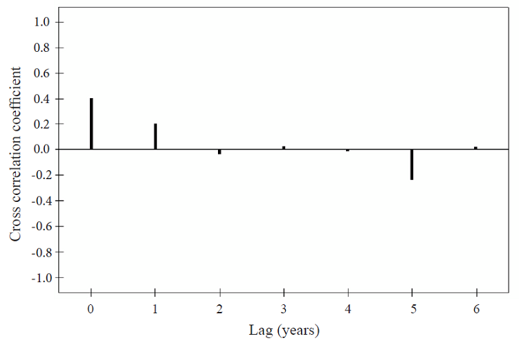 Therefore, a doubt about whether or not the evidenced ENSO extreme event effects remain more than 12 months starting since they started. Thus, cross correlation coefficients were estimated by involving pairs of variables significantly correlated. For instance, Figure 2 shows July-August-September ONI correlates with the Mexico’s orange annual mean yield standardized anomalies since the ENSO extreme event starts (Lag 0, rc= 0.4, P ≤ 0.05). Similar results were estimated for the remaining strongly correlated pairs of variables (data not shown). Then, those results indicate that the positive relationship may be important within a year, i.e. ENSO and the orange annual mean yield standardized anomalies can be strongly tele connected. Then, Mexican orange orchard managers/owners should have in mind this possible strong relationship to take advantage on and to avoid possible insects, weeds, and pathogens proliferation. This recommendation could be important because most pest species may be favored by warm and humid atmospheric conditions (Iglesias and Rosenzweig, 2007).