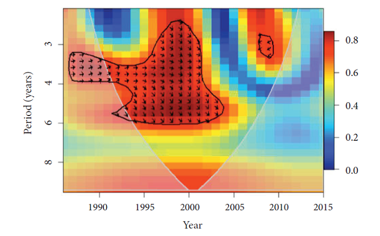 Grinsted, A., J. C. Moore, and S. Jevrejeva. 2004. Application of the cross wavelet transform and wavelet coherence to geophysical time series. Nonlin. Proc. Geophys. 11: 561-566. doi: https://doi.org/10.5194/npg-11-561-2004.