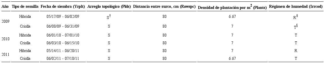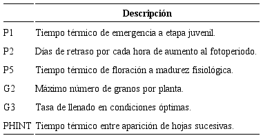 Para maíces criollos los coeficientes se generaron a partir del Catálogo de Maíces Nativos de Oaxaca (Aragón et al., 2006) y del estudio de complejos raciales de poblaciones de maíz evaluadas en San Martín Huamelulpan, Oaxaca (Chávez et al., 2011). Con base en estas fuentes se tomaron valores promedio de días a floración masculina y femenina, longitud y diámetro de la mazorca; hileras por mazorca y granos por hilera (Cuadro 2). A partir de las características fenológicas reportadas en la literatura, los coeficientes genéticos de referencia fueron modificados hasta lograr el mejor ajuste a los rendimientos reportados por el Programa de Mejoramiento a la Producción de Maíz y Frijol 2009-2011 (PROMAF).