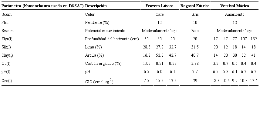 Las propiedades físicas y químicas de los tres principales tipos de suelo empleados en la calibración y validación se presentan en el Cuadro 5.