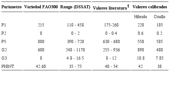 Durante la calibración de los cultivares híbridos y criollos se variaron los coeficientes genéticos a fin de reducir la diferencia global entre rendimientos de grano observados y simulados, minimizar la raíz cuadrada del cuadrado medio del error (RMSE) y acercar el coeficiente de determinación (r2) a uno. Los valores que se tomaron como base para iniciar la calibración de estos coeficientes fue el cultivar FAO300 (Lizaso et al., 2018) propuesto para zonas tropicales (Cuadro 7).