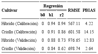 Los coeficientes genéticos resultantes de la calibración, para materiales híbridos y criollos, se usaron para correr el modelo con las parcelas restantes y así realizar el proceso de validación. Para las pruebas de bondad de ajuste del modelo en el proceso de calibración y validación se utilizaron los parámetros del análisis de regresión (b1 y r2), la raíz del cuadro medio del error (RMSE) y el porcentaje de sesgo (PBIAS) para los coeficientes genéticos, se muestran en el Cuadro 8.