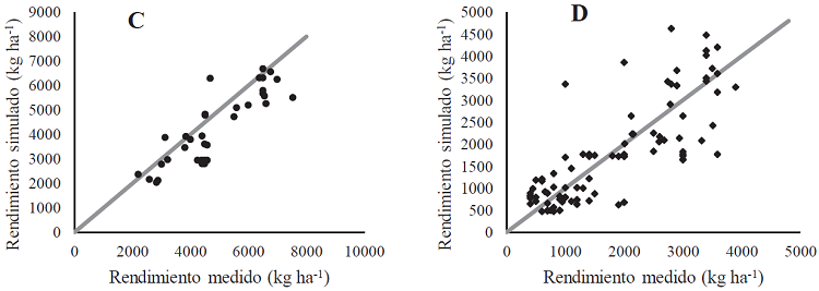 En la Figura 2 se presenta la comparación entre rendimientos de grano simulados y medidos para cultivares híbridos y criollos de las parcelas utilizadas en la calibración. Para los cultivares criollos se observa que los datos se conforman en tres grupos y no de manera uniforme como ocurre con los cultivares híbridos. Esto se atribuye a las diferencias en la duración del ciclo del cultivo, así, las parcelas con rendimiento alrededor de 1000 kg ha-1 presentan un ciclo menor de 120 días, las parcelas con rendimientos entre 2000 y 3000 kg ha-1 tienen ciclos entre 165 y175 días y las parcelas con rendimientos mayores a 3000 kg ha-1 alcanzan ciclos entre 170 y 200 días; esta diferencia de ciclos en los cultivares criollos de la región, están directamente relacionados con la variabilidad de la precipitación de los distintos municipios.